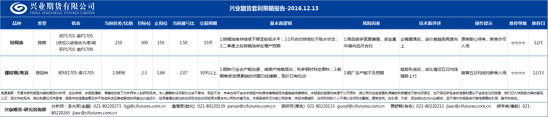 - 2016-12-13 兴业期货套利策略日报2016-12-13