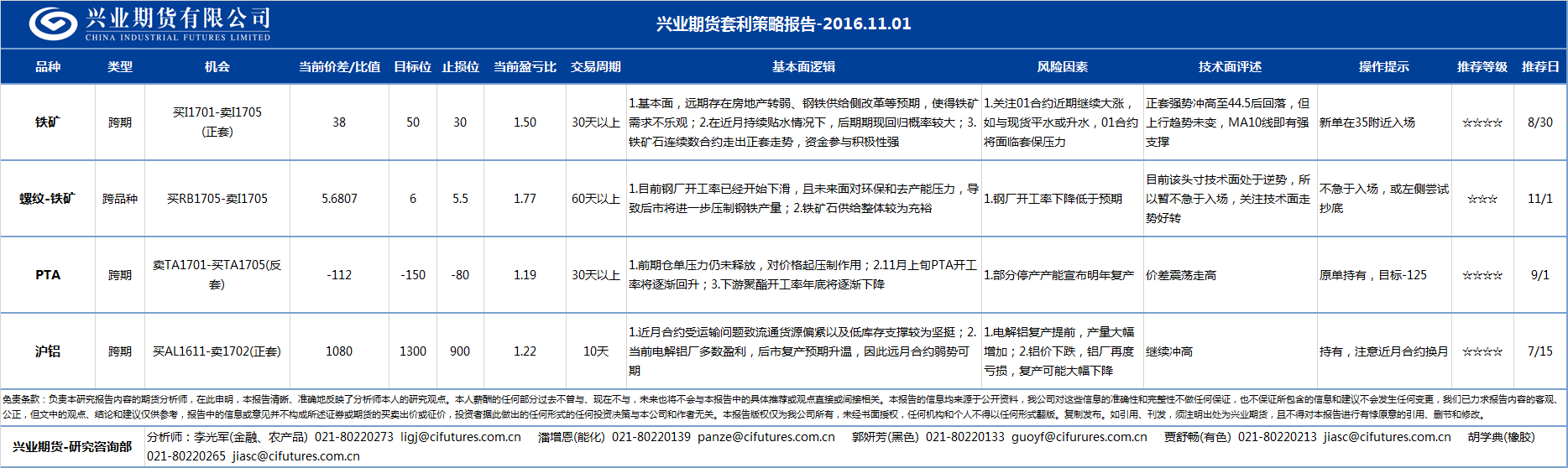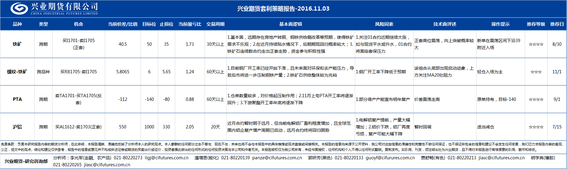 - 2016-11-03 兴业期货套利策略日报2016-11-03