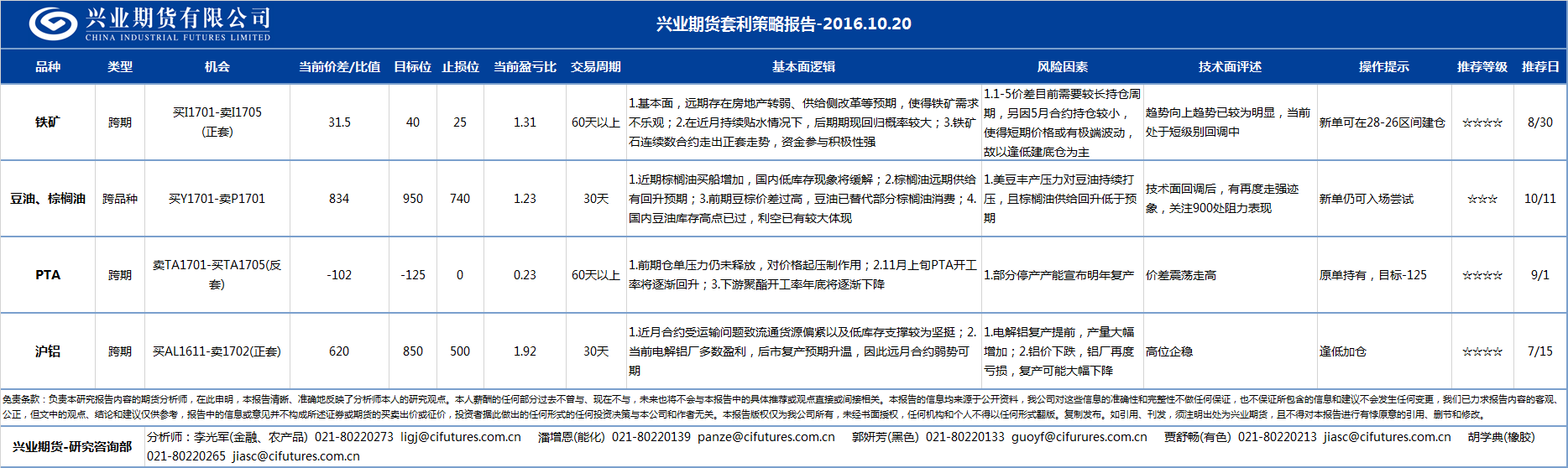 - 2016-10-20 兴业期货套利策略日报2016-10.20