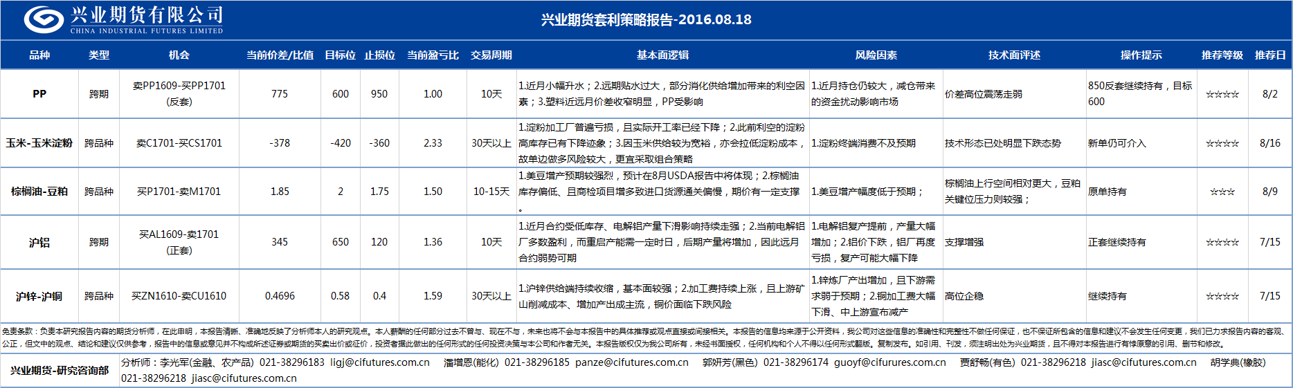 - 2016-08-18 兴业期货套利策略日报2016-08-18