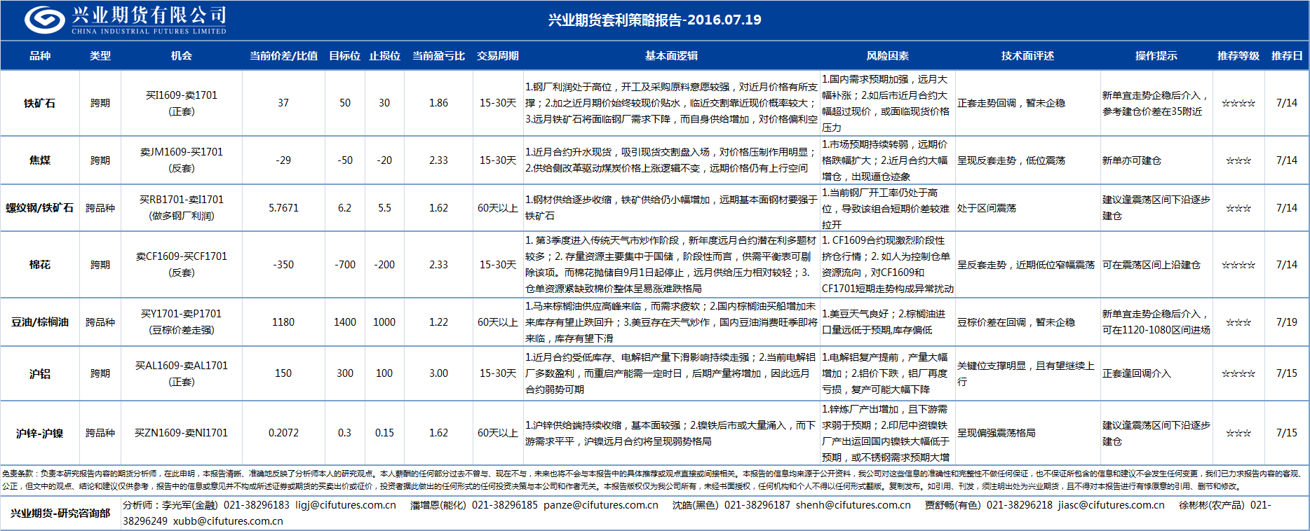 - 2016-07-20 兴业期货套利策略日报2016-07-19